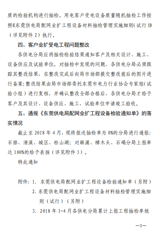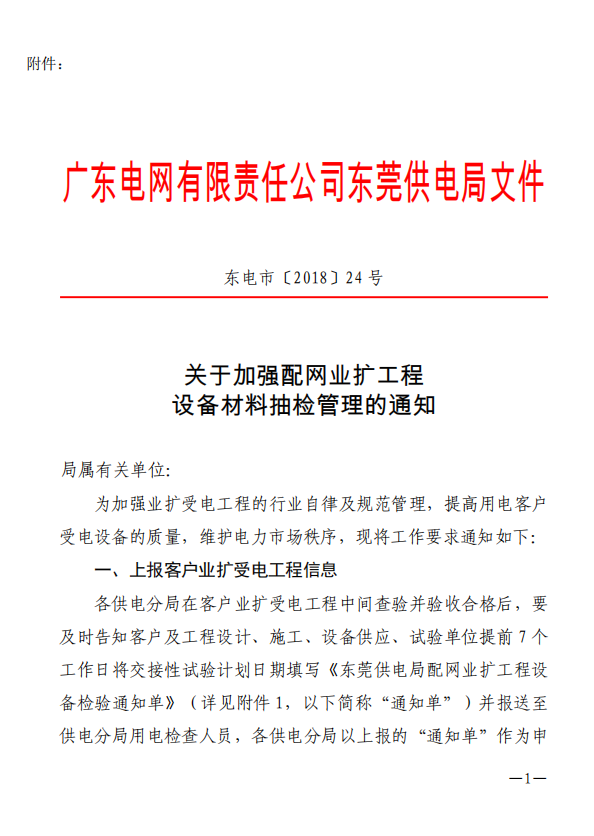 東莞電行〔2018〕23號--轉(zhuǎn)發(fā)東莞供電局《關(guān)于加強配網(wǎng)業(yè)擴工程設(shè)備材料抽檢管理的通知》